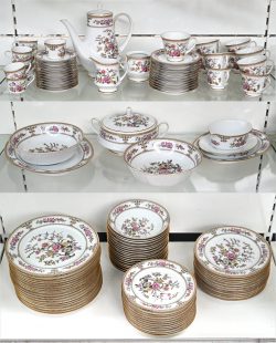 Een Noritake porseleinen eetservies waaronder: 18 soepborden, 18 platte borden een soepterrine, twee schotels, twee kommen en een sauskom. Een koffieservies waaronder: koffie, suiker zonder deksel en melkpot, 12 grote en 12 kleine koppen met schoteltjes en 12 grote en 12 kleine dessertborden Japan, asian dream.