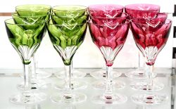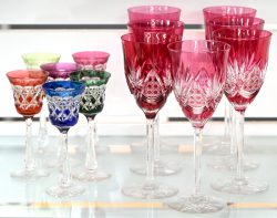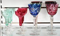 Een serie van zes gekleurde en geslepen sorbetglazen en een serie van zes grote wijnglazen van geslepen kristal in divere kleuren