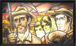 “Landbouwersgezin”. Een glas-in-loodraam gemonteerd op een lichtbak. Getekend; Leo Vingerhoets.