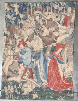 Een reproductie van een oud wandtapijt met middeleeuws tafereel. Ateliers d’art Lys de France.