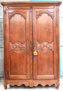 Een grote eikenhouten koffer met een gegalbeerd deksel en smeedijzeren beslag. XIXe eeuw.