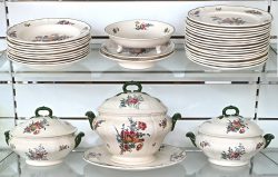 Een servies gedeelte bestaande uit 10 diepe borden, 17 platte borden, 3 terrines met deksel, 1 grote schotel, 1 taartschotel en een aardbeienkom. Villeroy & Boch, met gebloemd decor.