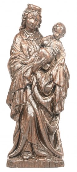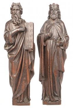 Twee fijn gebeeldhouwde palmhouten beeldjes. Het ene van Mozes, het andere van Karel de Grote (zonder handen). Neorenaissance, omstreeks 1900.