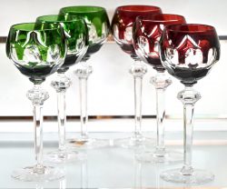 Zes gekleurd kristallen wijnglazen, rode en groene, gelabeld Barthmann, cristall 30’/. Blei, Handarbeit.