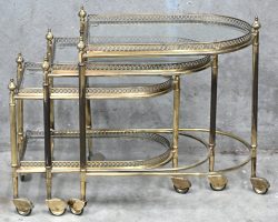 Een ‘nest of tables’, 3-delig, messing en glas, halfrond.