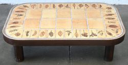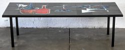 Een vintage salontafel met tegelblad, getekend; Denisco. Met een decor van flessen en cocktailglazen. Enkele tegels zijn gebarsten.