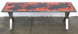 Een vintage salontafel met tegelblad op een verchroomd metalen onderstel. Met een decor van drie oranje sterren op een grijze achtergrond.