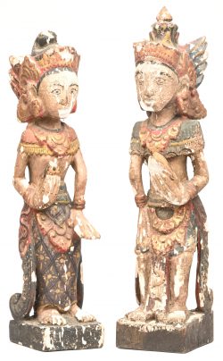Een paar polychrome houten beeldjes, Indonesische oorsprong.