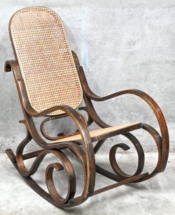 Een vintage schommelstoel met gevlochten zitting en rugleuning.