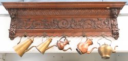 Een koperen wandfontein met kraantje en reservoir, op eikenhouten plaat.