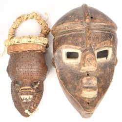 Twee Afrikaanse maskers, het kleine masker met koper gedecoreerd, Salampasu, Congo en een groter masker met witte accenten.