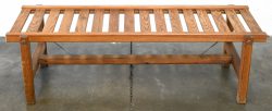 Een antieke cilindervormige houten koffer met smeedijzeren beslag.