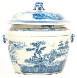 Een dekselpot van geglazuurd Chinees aardewerk. Met in het decor een paleis aan de waterkant.