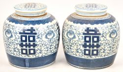 Een lot van twee gemberpotten, blauw-wit geglazuurd Chinees aardewerk. Met een decor van lotusbloemen en het symbool voor een lang leven op de deksels. Van de kleinste gemberpot mist het deksel enkele chips.