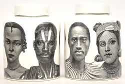 Een set van zes porseleinen ‘kruidenpotten’ met als opschrift; Opium, Cyanic, Novocaine, Digitalis, Arsenicum en Morfine.