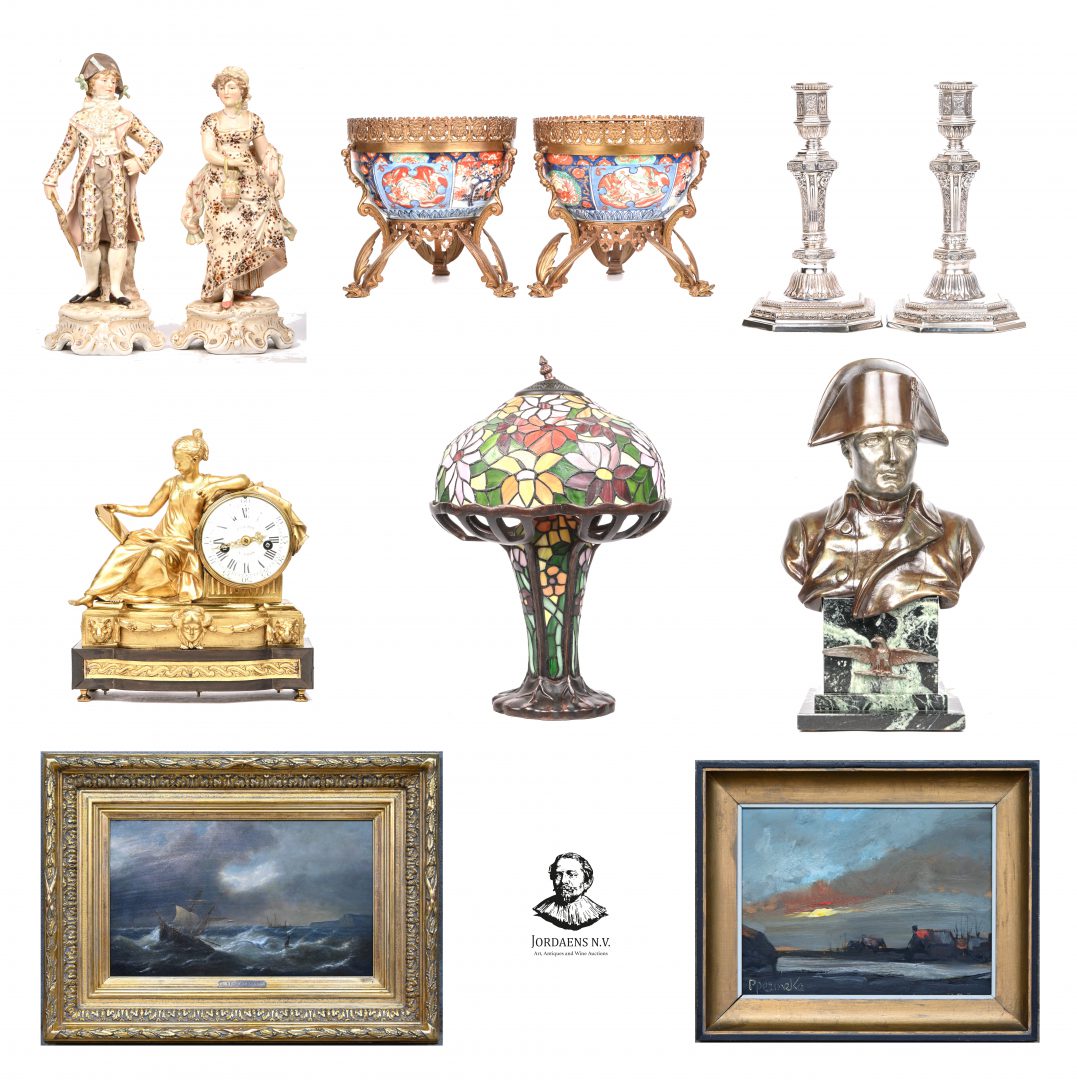 Jordaens N.V., Mortsel (Antwerp) presents an elegant selection of 19th–20th-century European antiques in our upcoming auctions. Highlights include a gilded ormolu mantel clock with allegorical figure, Tiffany-style stained-glass lamp, pair of silver candlesticks, gilt-mounted porcelain centerpiece bowls, rococo figurines, a bronze bust of Napoleon Bonaparte on marble, and framed oil paintings (marine and harbour landscapes).