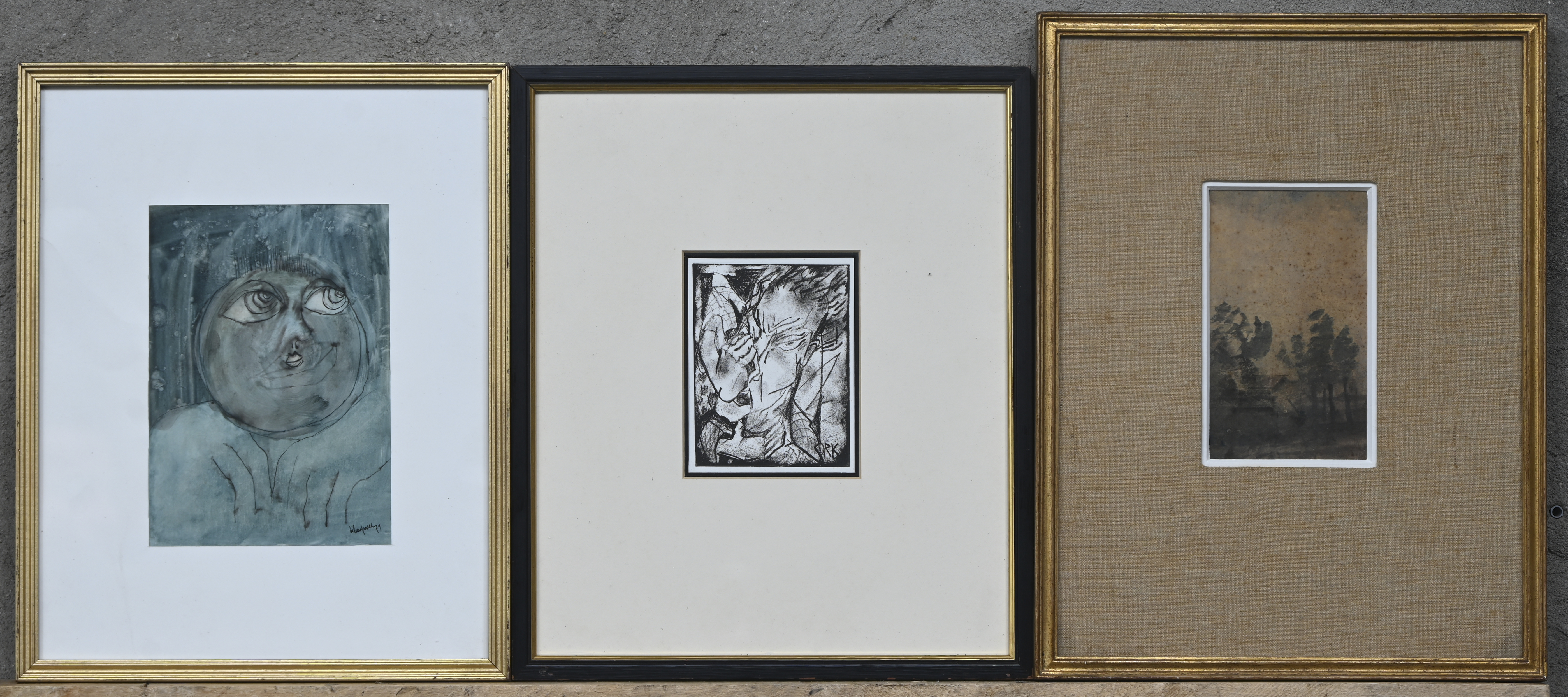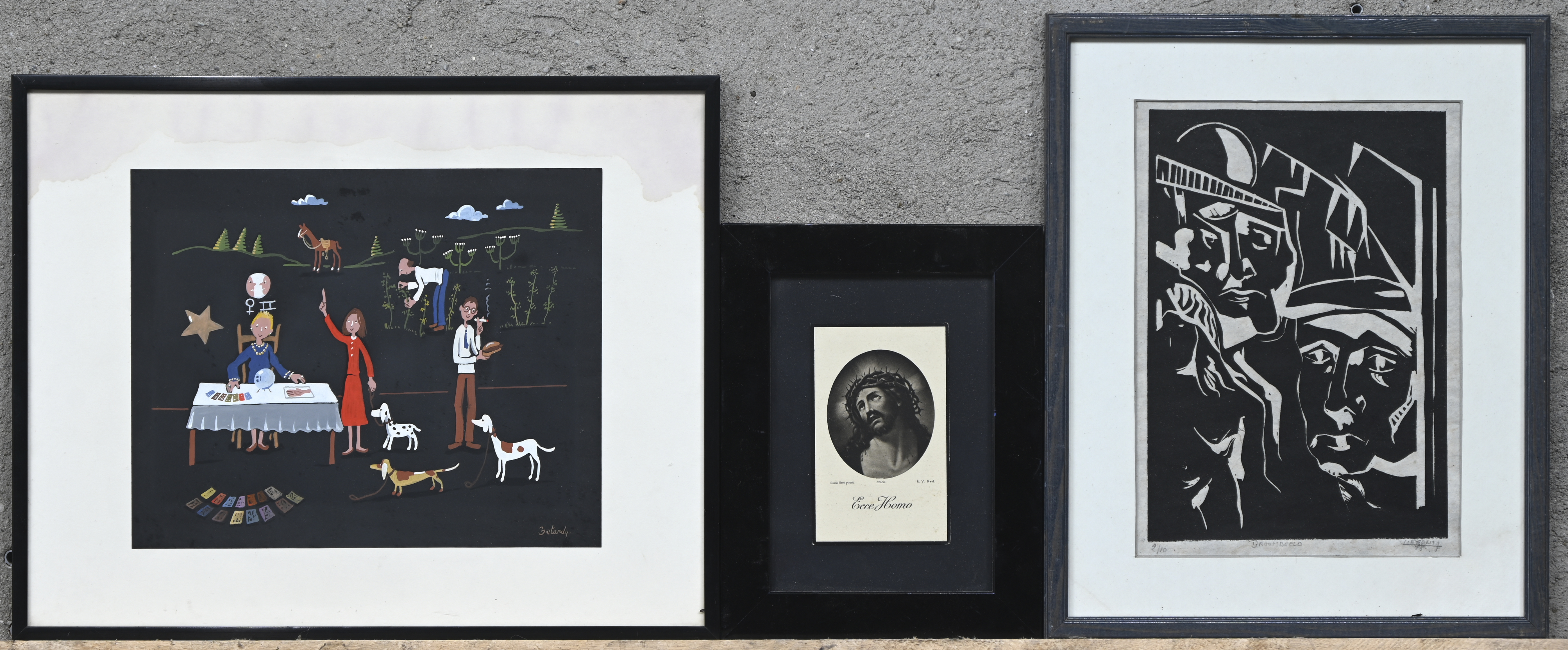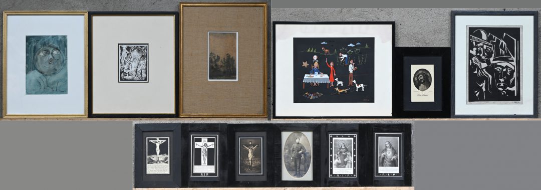 12 diverse grafische werken. “Droombeeld” lino door L. Goderis genummerd 2/10. “Hoofd” door Verspreet. “Toekomst” door Zatardy. E.a. waaronder ingelijste bidprentjes en een foto van een soldaat.