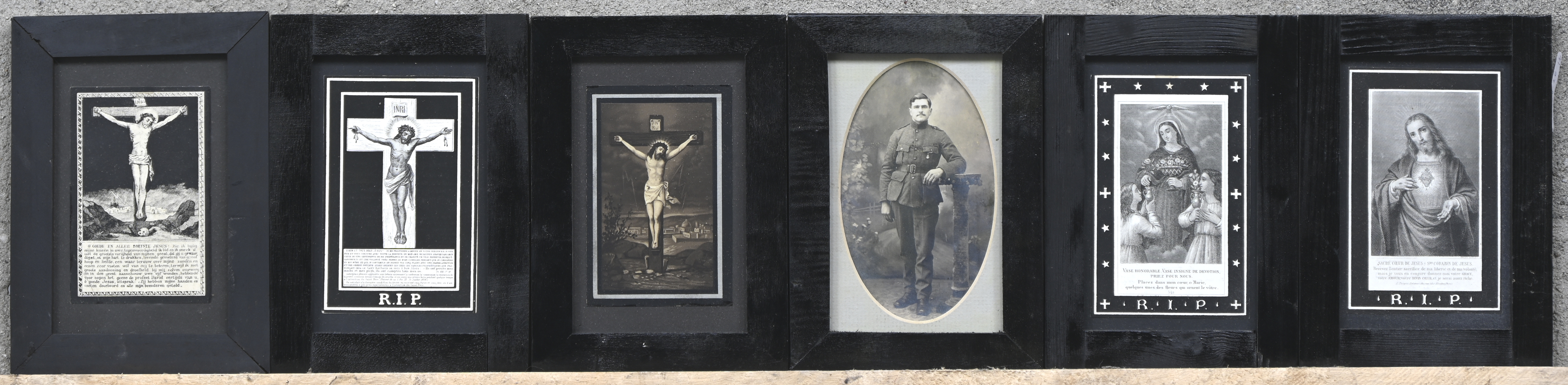 12 diverse graphic works. “Droombeeld” linocut by L. Goderis, numbered 2/10. “Hoofd” by Verspreet. “Toekomst” by Zatardy. Among others, including framed memorial cards and a photograph of a soldier.