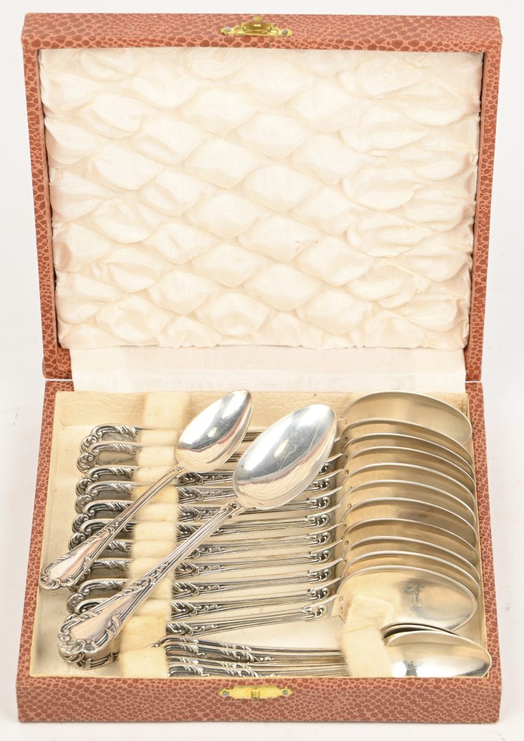 #201Twaalf zilveren lepeltjes in etui, gemerkt 800. Met een gezamelijk brutogewicht van 150 gram.