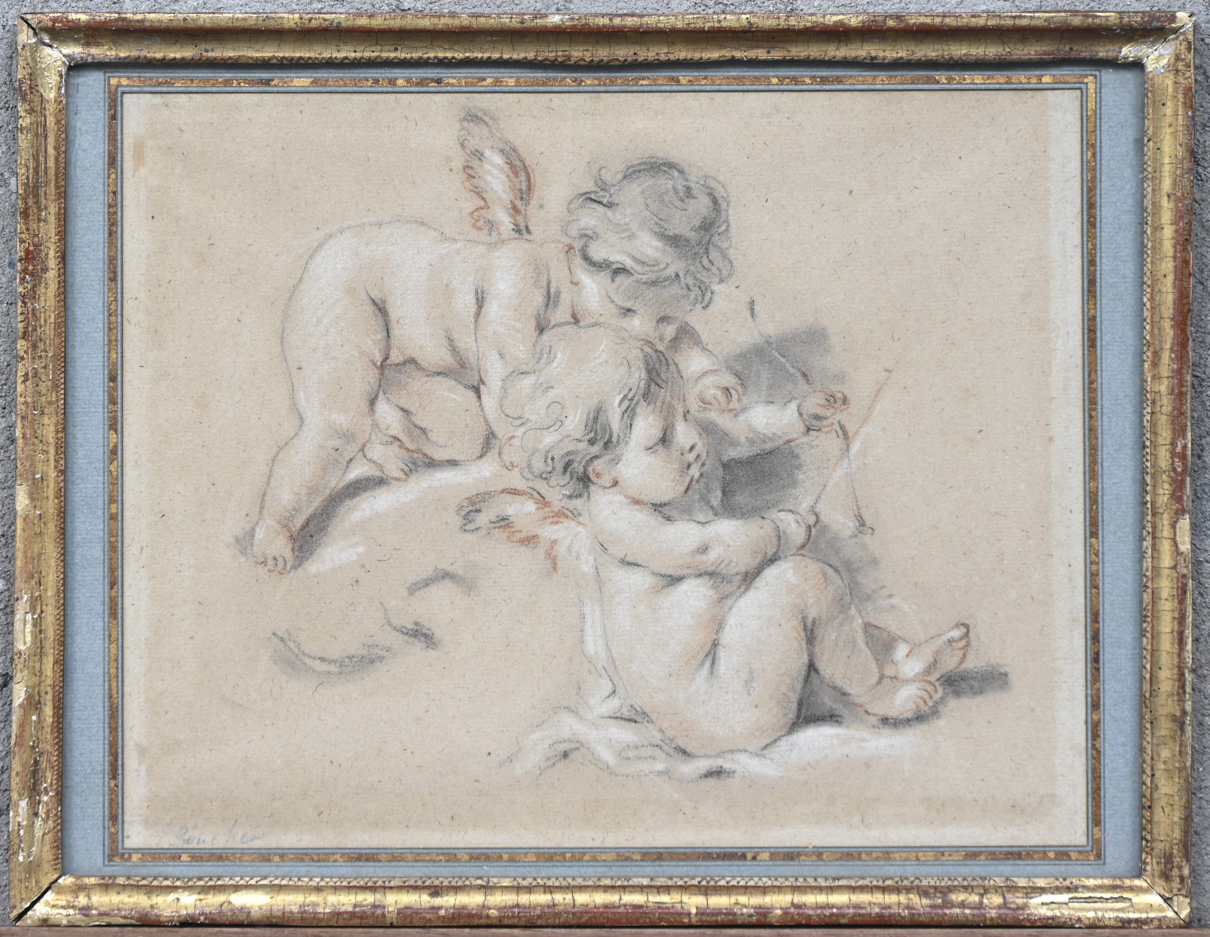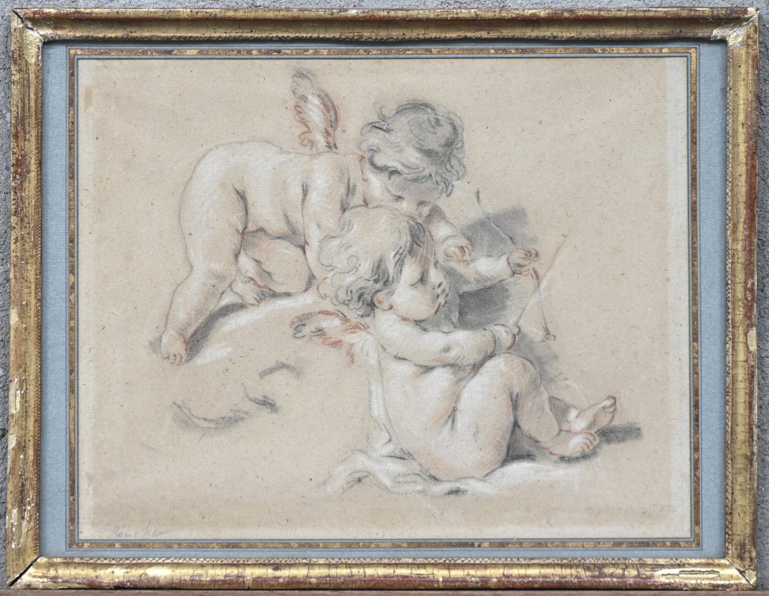 ‘2 putti’, an heightened chalk drawing. Red and black chalk on paper, signed F. Boucher.