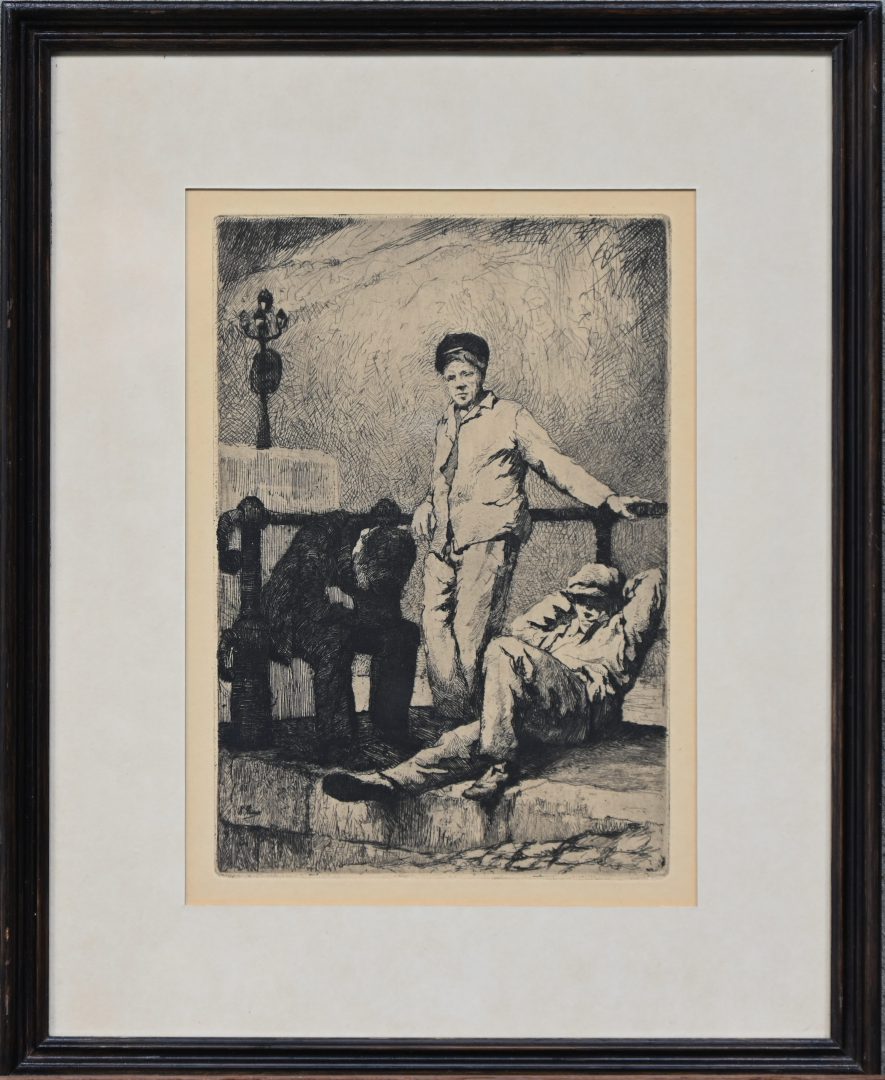“Aan de kade”, een ets, gesigneerd binnen de plaat, K. Peiser.