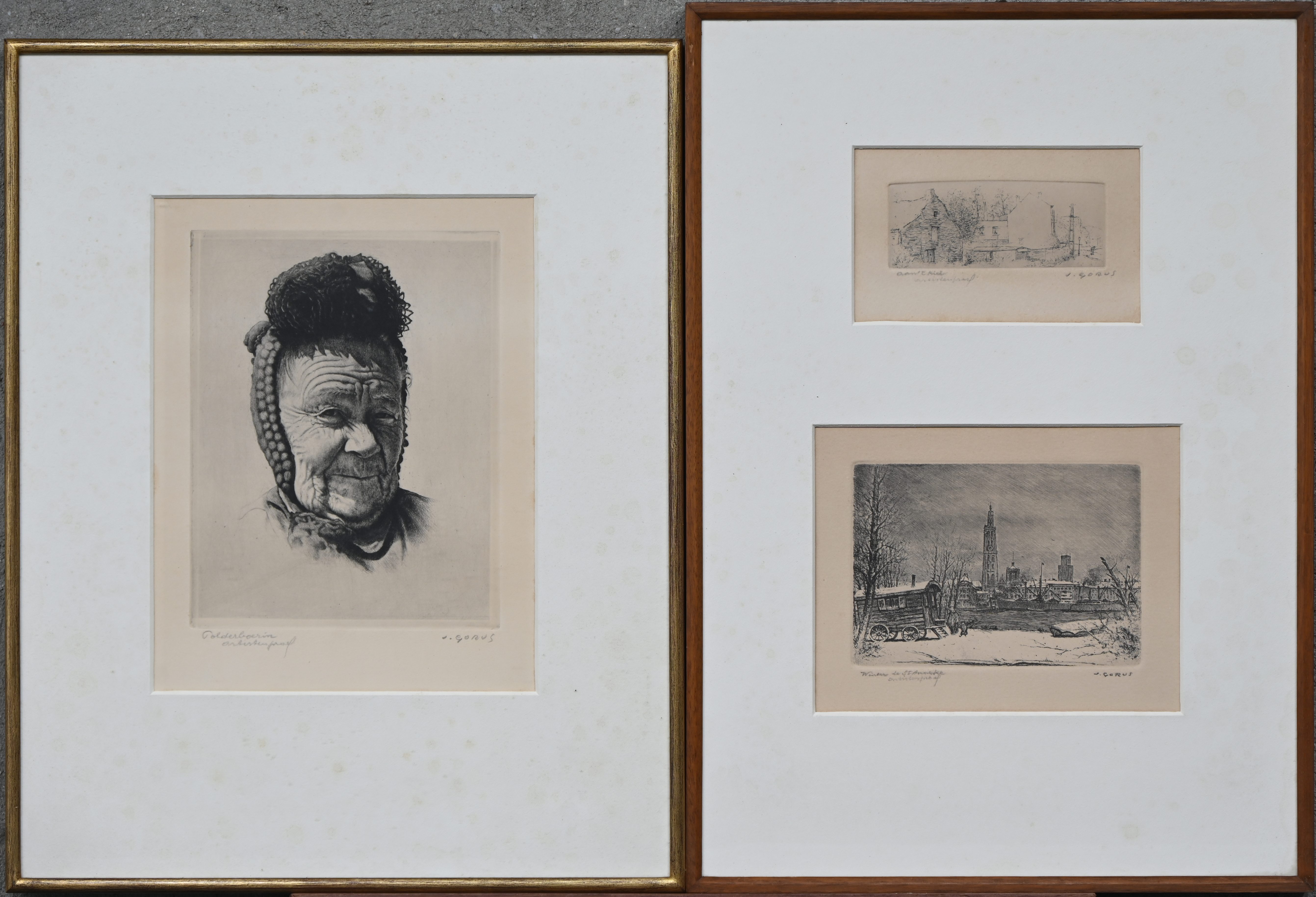 ‘Aan ‘t Kiel’, ‘Winter St. Anneke’, and ‘Polderboerin’. Three monochrome etchings in two frames. Signed J. Gorus.