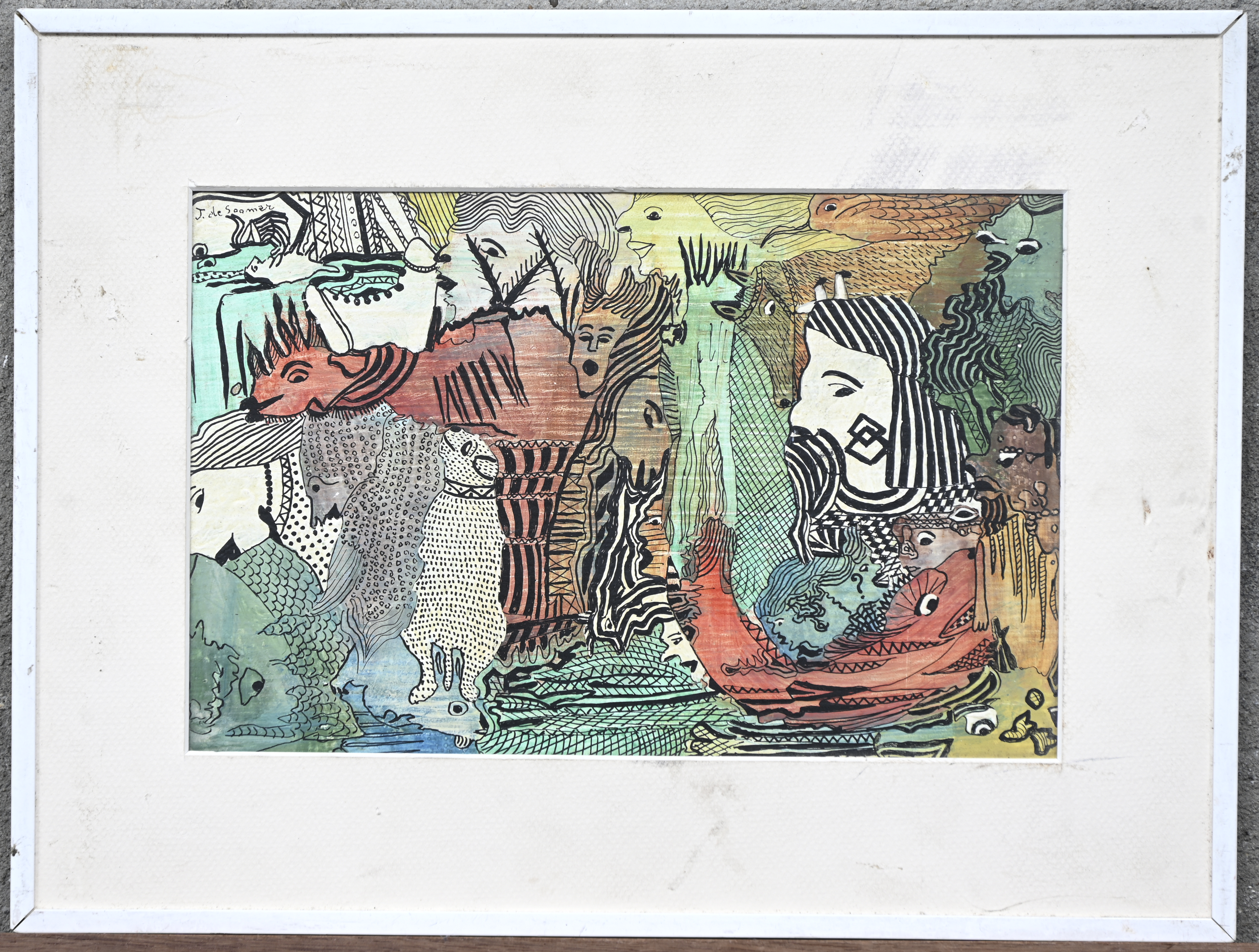 “Abstract composition with heads”, mixed media on panel. Signed J. De Soomer.