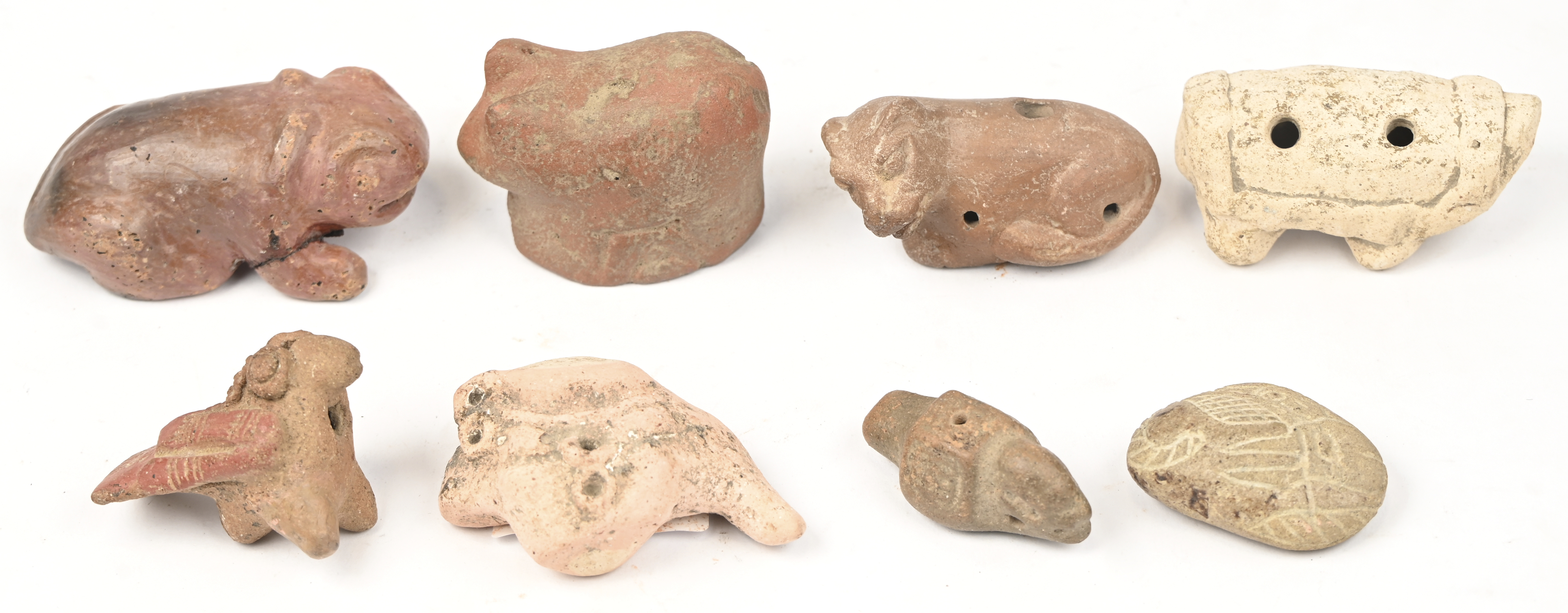 Eight animal figurines, seven made of pottery and one carved in stone. In Pre-Columbian style.