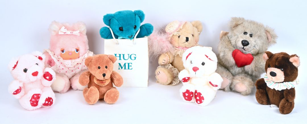 Eight small cuddly bears, various brands and sizes. ‘Graphics international’, ‘Felicia by Russ’, ‘K.C. & Co.’, 2 X ‘Wallace Berrie & Co.’, ‘Toi Toys’, ‘Embrace’ and ‘Dakin’.