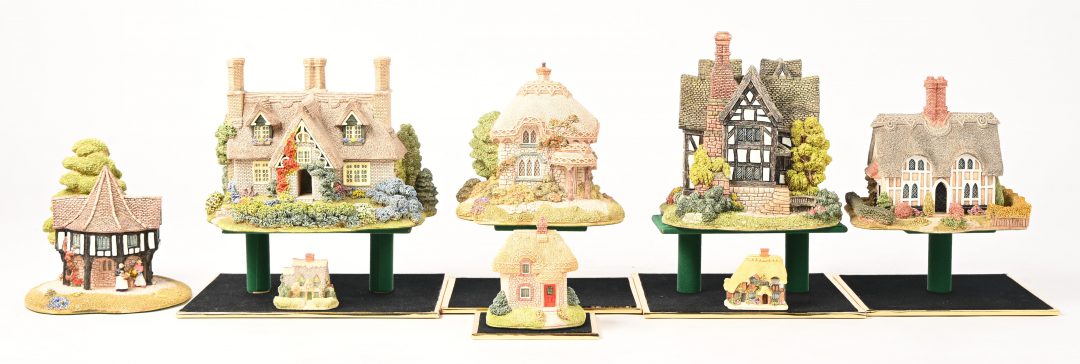 Acht ‘Lilliput Lane’ huisjes. In OVP, de meeste met attest. ‘Saffron House’, ‘The Priests House’, ‘Flower Sellers’, ‘Titmouse Copttage’, ‘Hopcroft Cottage’, ‘Sunnyside’, ‘Honneysuckle Cottage Miniature’ & ‘Cotman Cottage Miniature’.