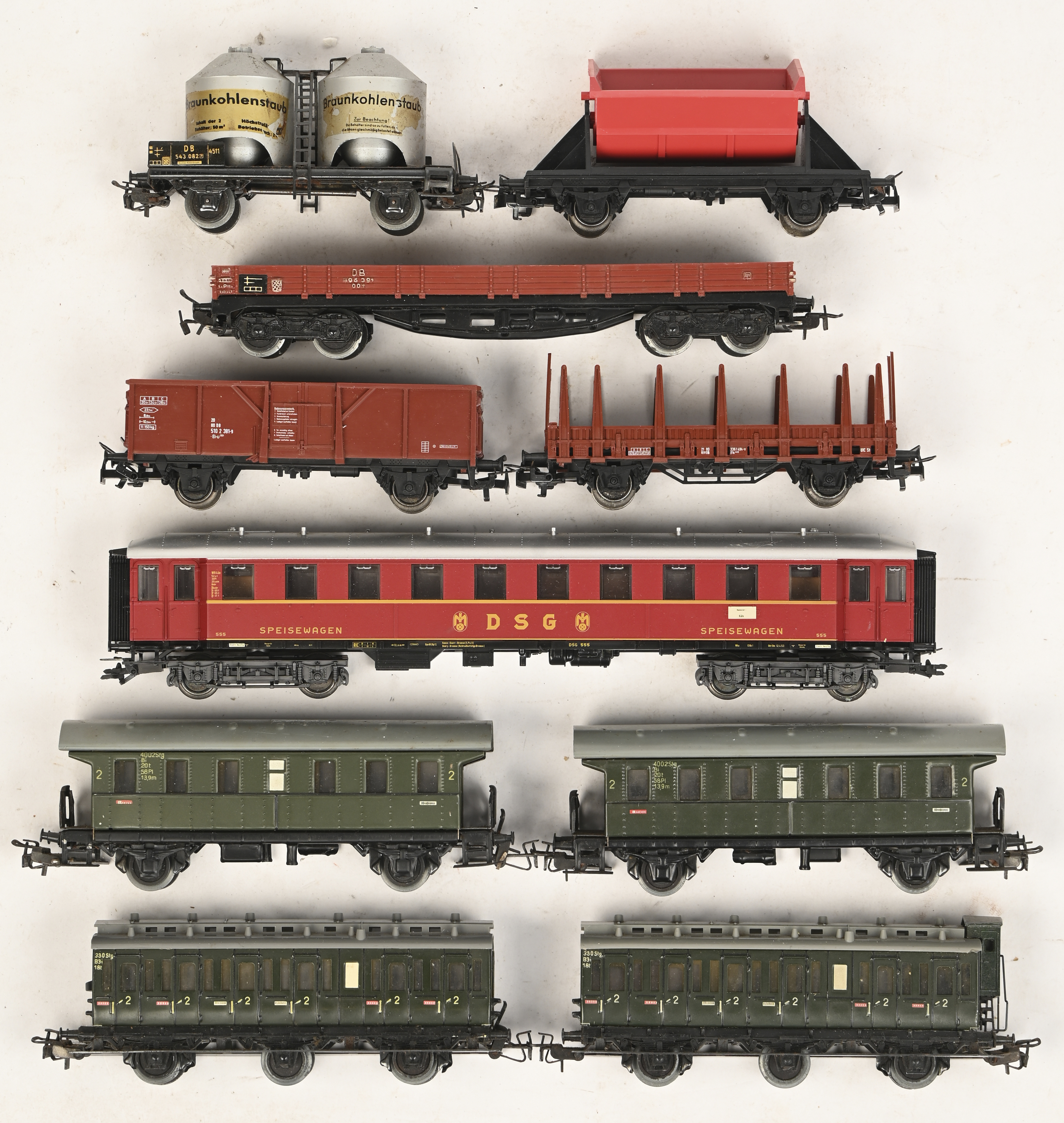 #152MärklinAcht oude Märklin wagons bestaande uit: 382 Gesloten goederenwagon ‘Fyffes Jamaica’ (1936); 386/3 (1946) Kippen transport wagen; 390.2 Bagage wagen (1939); 367 Talbot stortwagen (1939); 374 Esso tankwagen (1938); 372 Rongenwagen (1935); 391 Lageboordwagen; 1972/0 kipwagen. In goede vintage staat.
