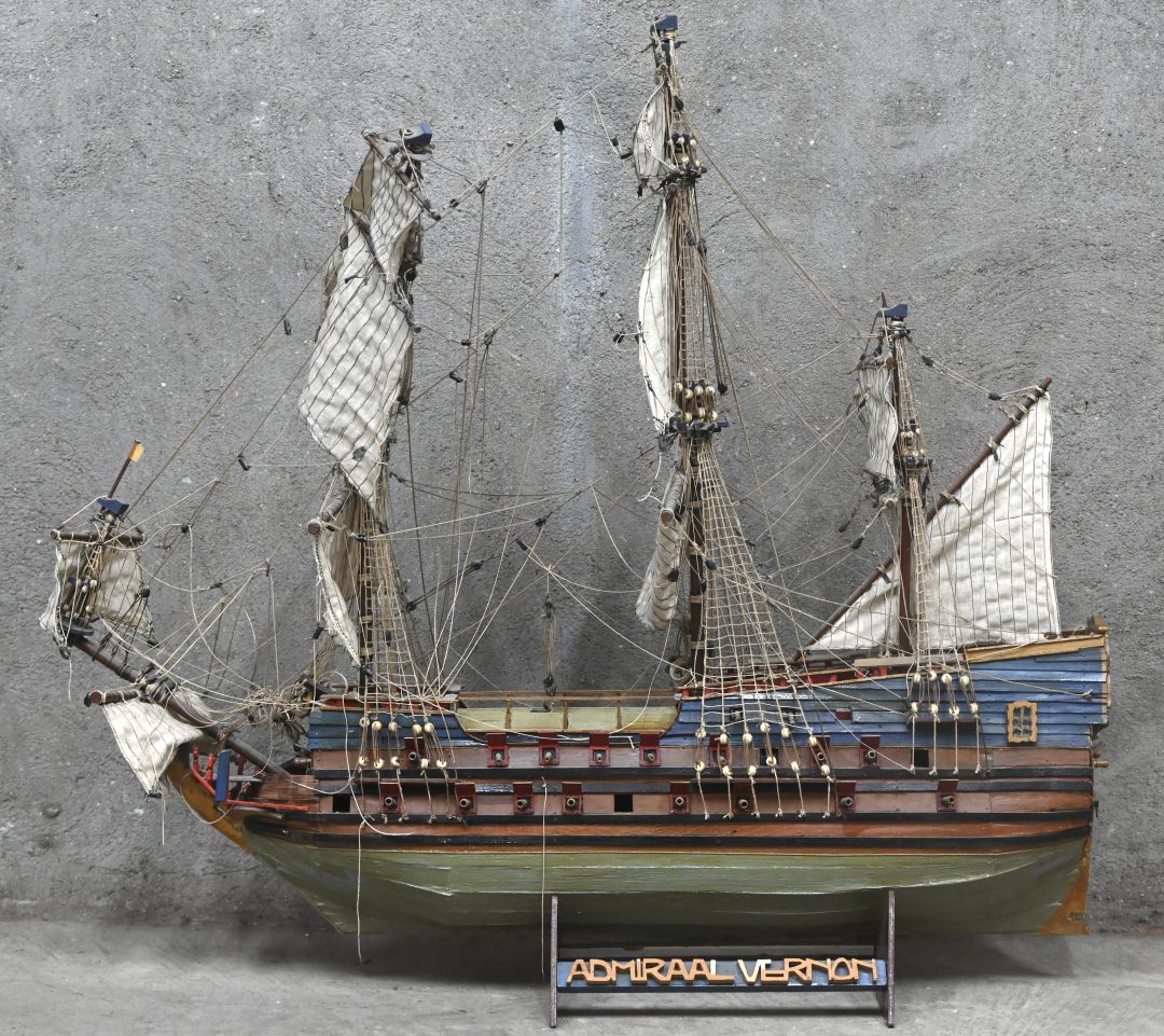 ‘Admiraal Vernon’. Een houten schaalmodel naar een Brits fregat. Met schade