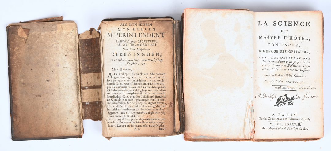 ‘Aen myn Heeren Superintendent’ & ‘La Science du Maître D’Hôtel’. Twee antieke boeken gedateerd MDCCLXXXVII (1788).