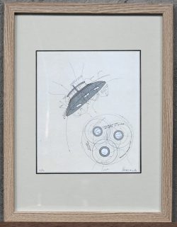 #212‘Vliegende schotel’, een ingekaderde offset print naar het werk van Panamarenko.