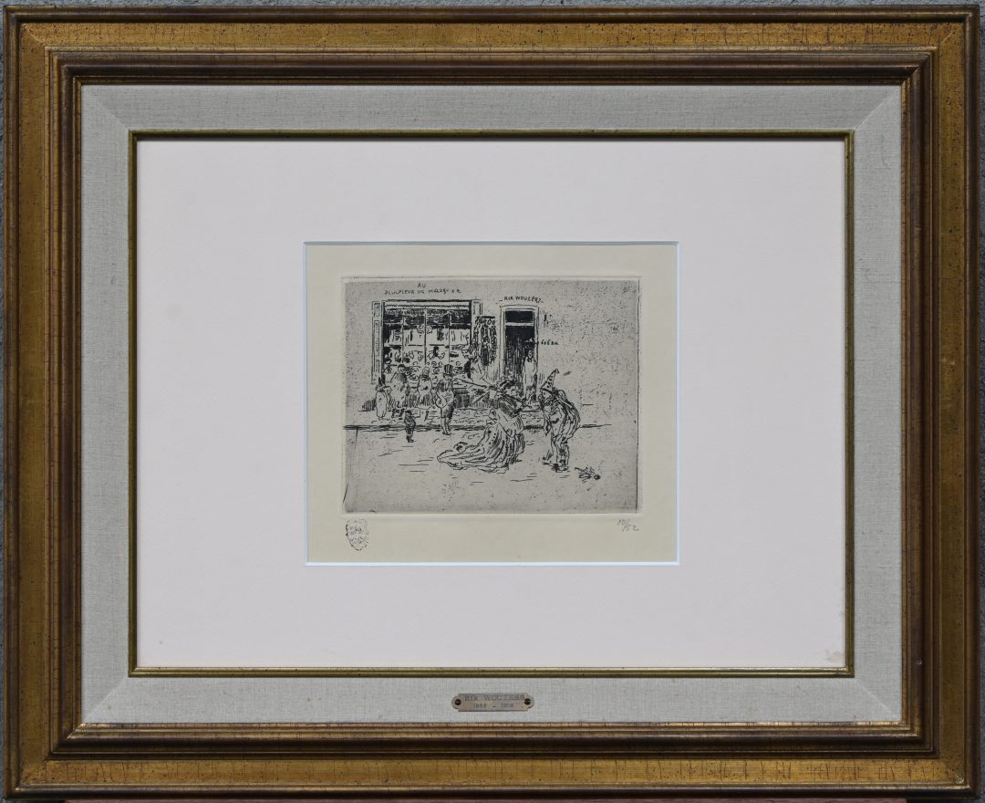 ‘Au Sculpteur de Masques’, een monochrome ets getekend binnen de plaat ‘Rik Wouters’. Draagt de portretstempel van Rik Wouters en is genummerd 10/52.