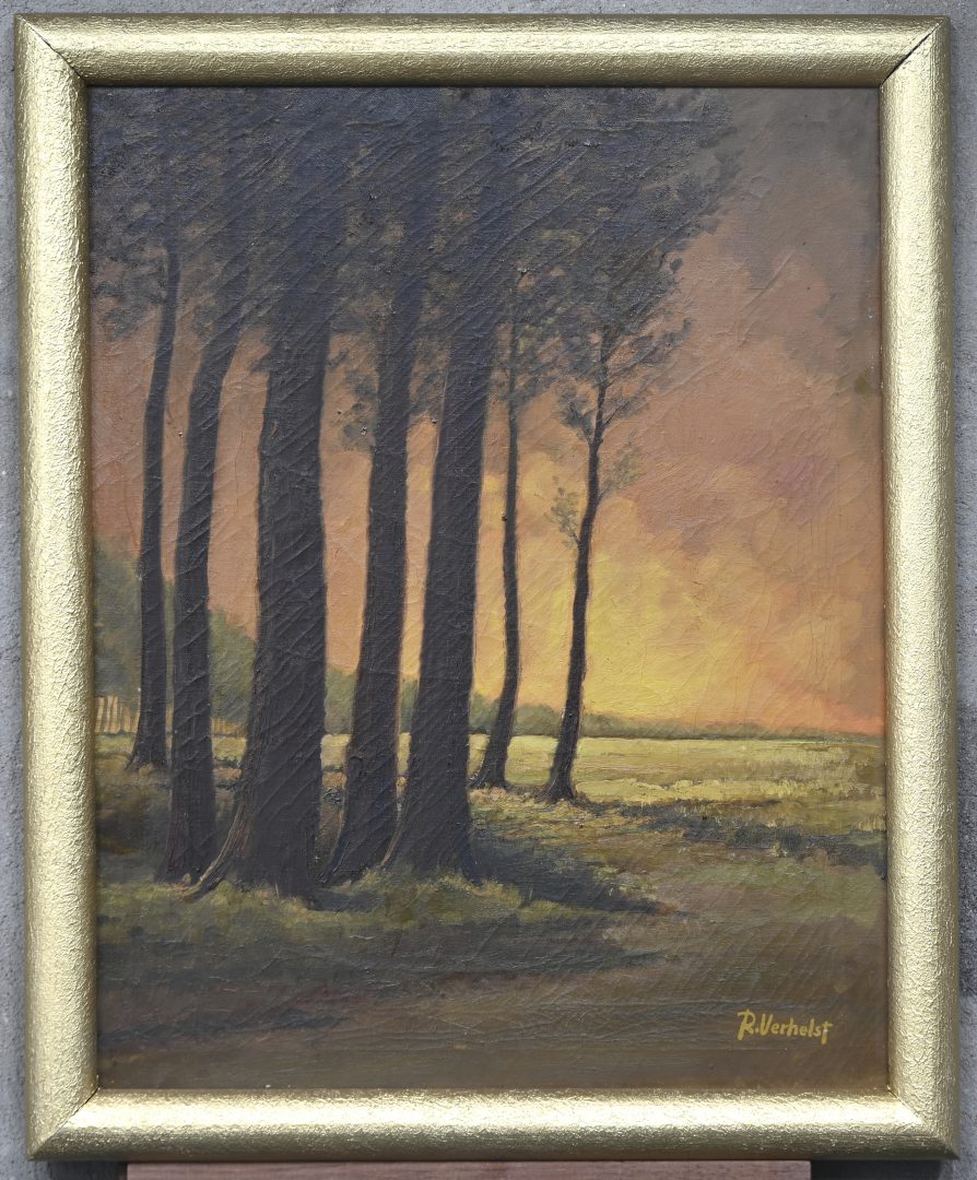 ‘Avondrood’. Olieverf op doek, getekend; R. Verhelst.