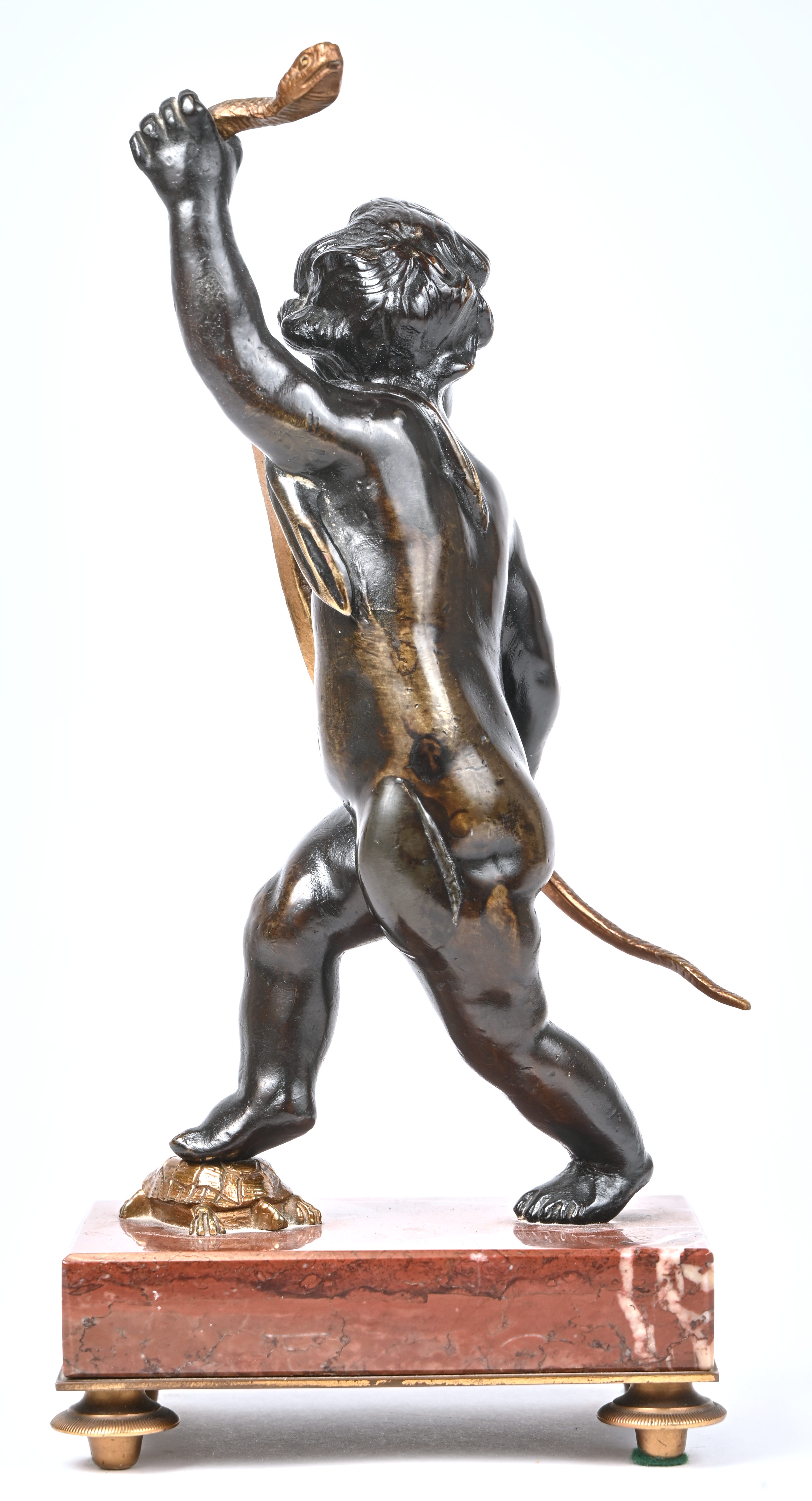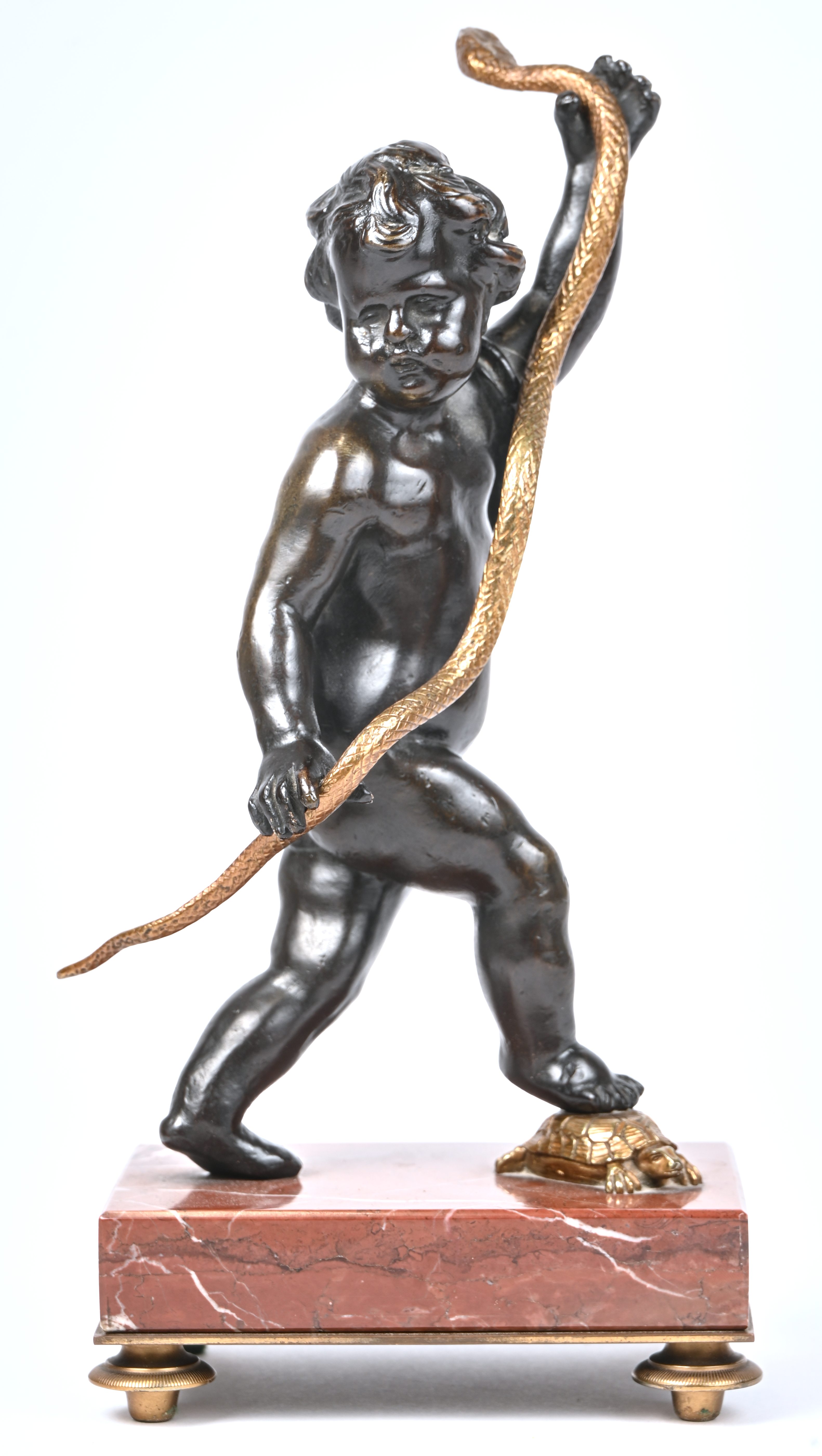 ‘Baby Hercules’, een gepatineerd bronzen beeldje van baby Hercules die een slang wurgt en met één voet op een schildpad staat. Gemonteerd op een roodmarmeren voetje.