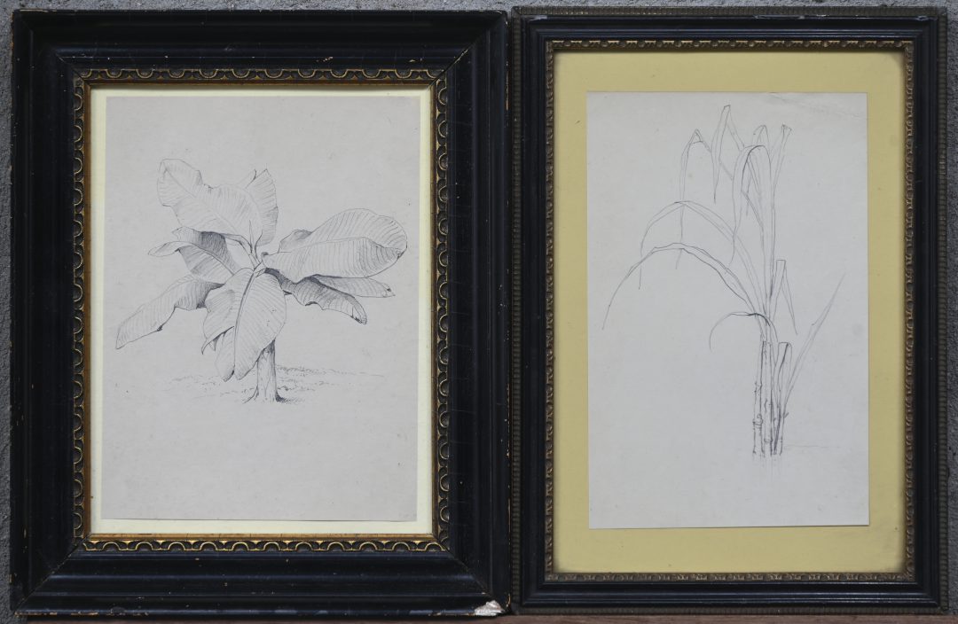 ‘Bananenplant’ en ‘rietsuiker’, twee potloodtekeningen op papier. Toegeschreven aan Eugène Verboeckhoven (1798/99-1881). Met provenance uitgeschreven door ABACA SRL (Association Brussels Arts and Culture Auctions).
