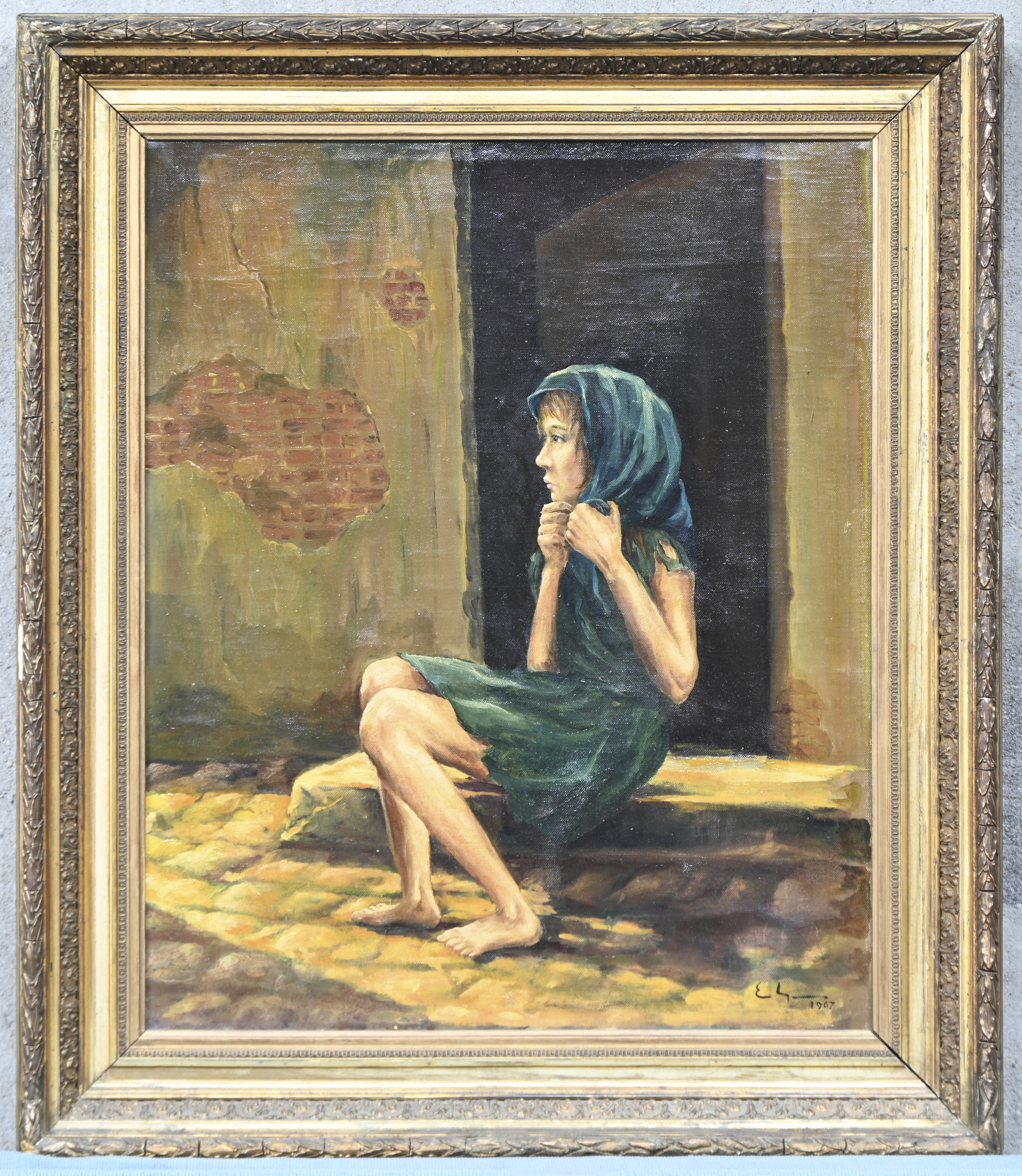 #135“Figuratief abstract”. Een schilderij, olieverf op paneel. Onderaan gesigneerd.