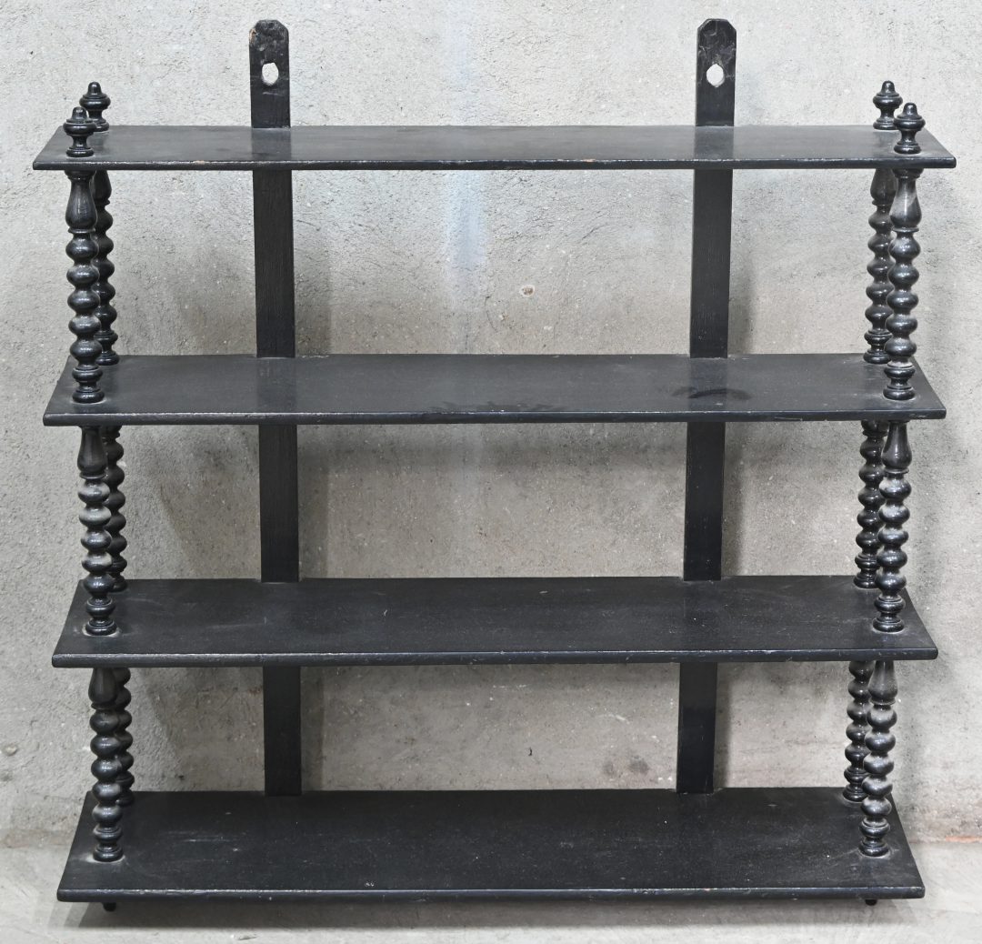 Een zwart geschilderd antiek massief eikenhouten wandrekje.