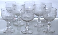#301Een set van acht geblazen en gegraveerde borrelglazen op voet.