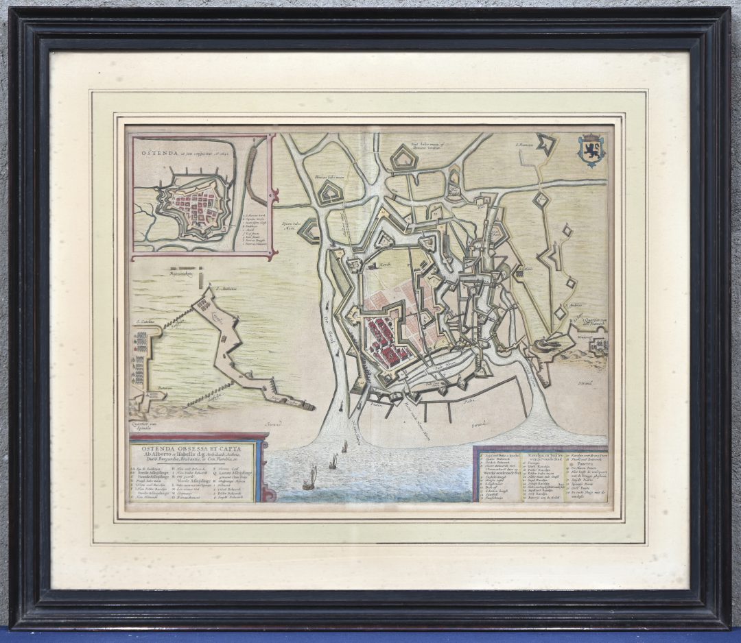 Beleg van Oostende, een ingekleurde antieke stadskaart van de verdedigings- en aanvalslinies rondom de stad en in het omliggende gebied. Links het kwartier van Spinola, rechts het kwartier van aartshertog Albrecht. Onderaan twee cartouches met de titel en de legenda's A-R en 1-34. Linksboven een inzet met een plattegrond van de stad in 1641.