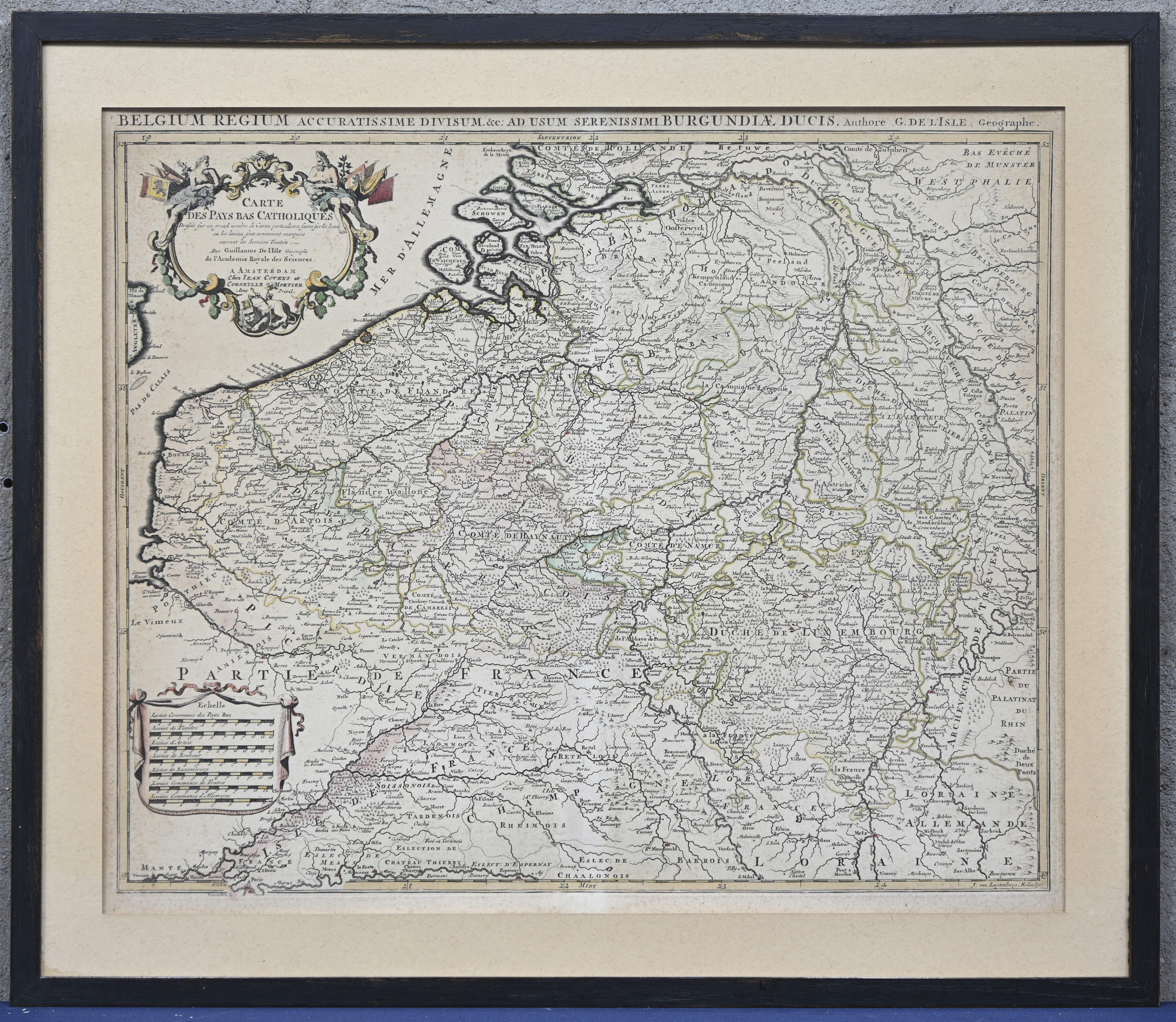 ‘Belgium Regium, Carte Des Pays Bas Catholiques’, een ingekleurde antieke stadskaart door Guillaume de l'Isle. Met centrale vouw. 18e eeuw.