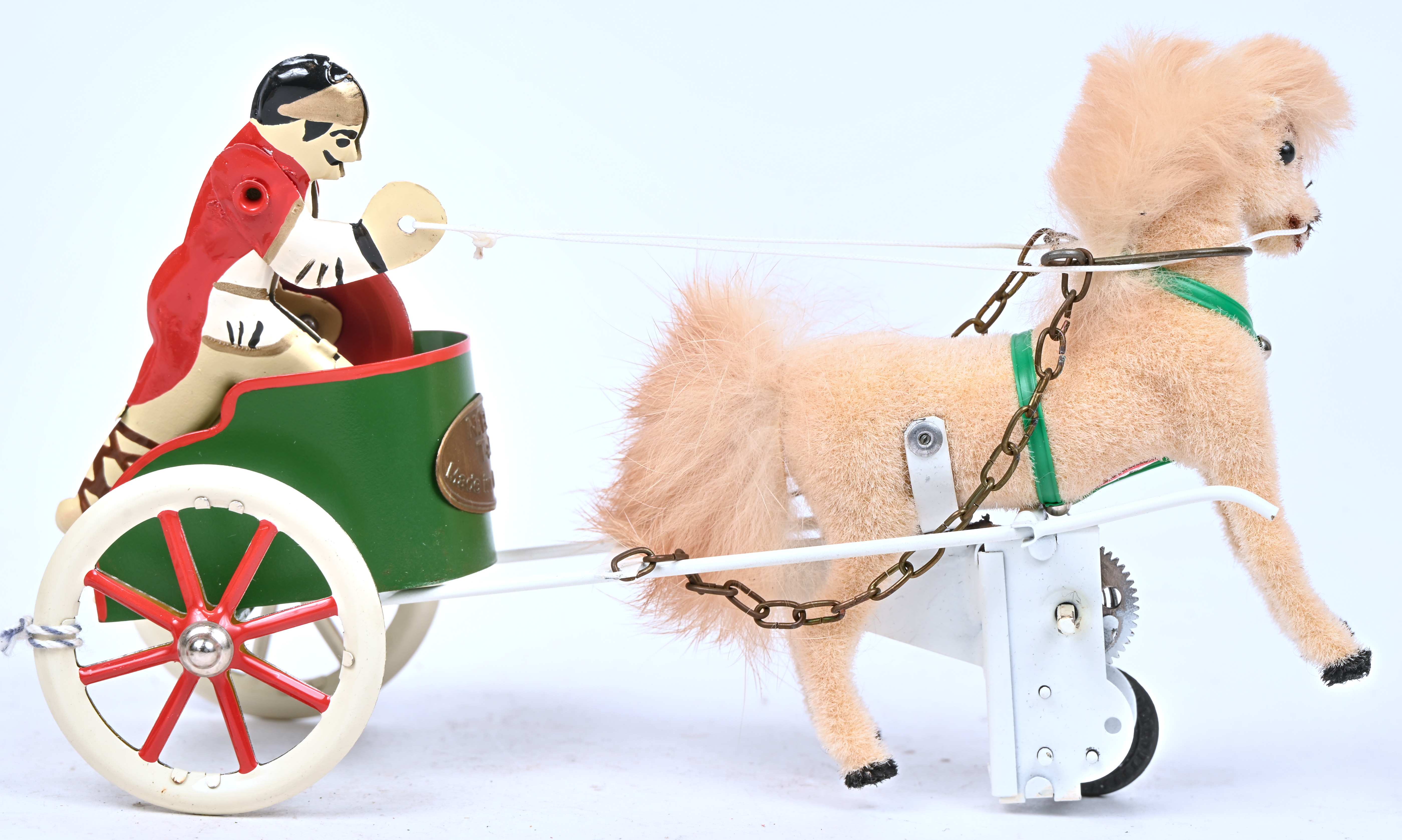 #22Nürnberger Bleichwaren Tucher & WalterTwee blikken straatvenders met een vliegwiel aangedreven karretje.
