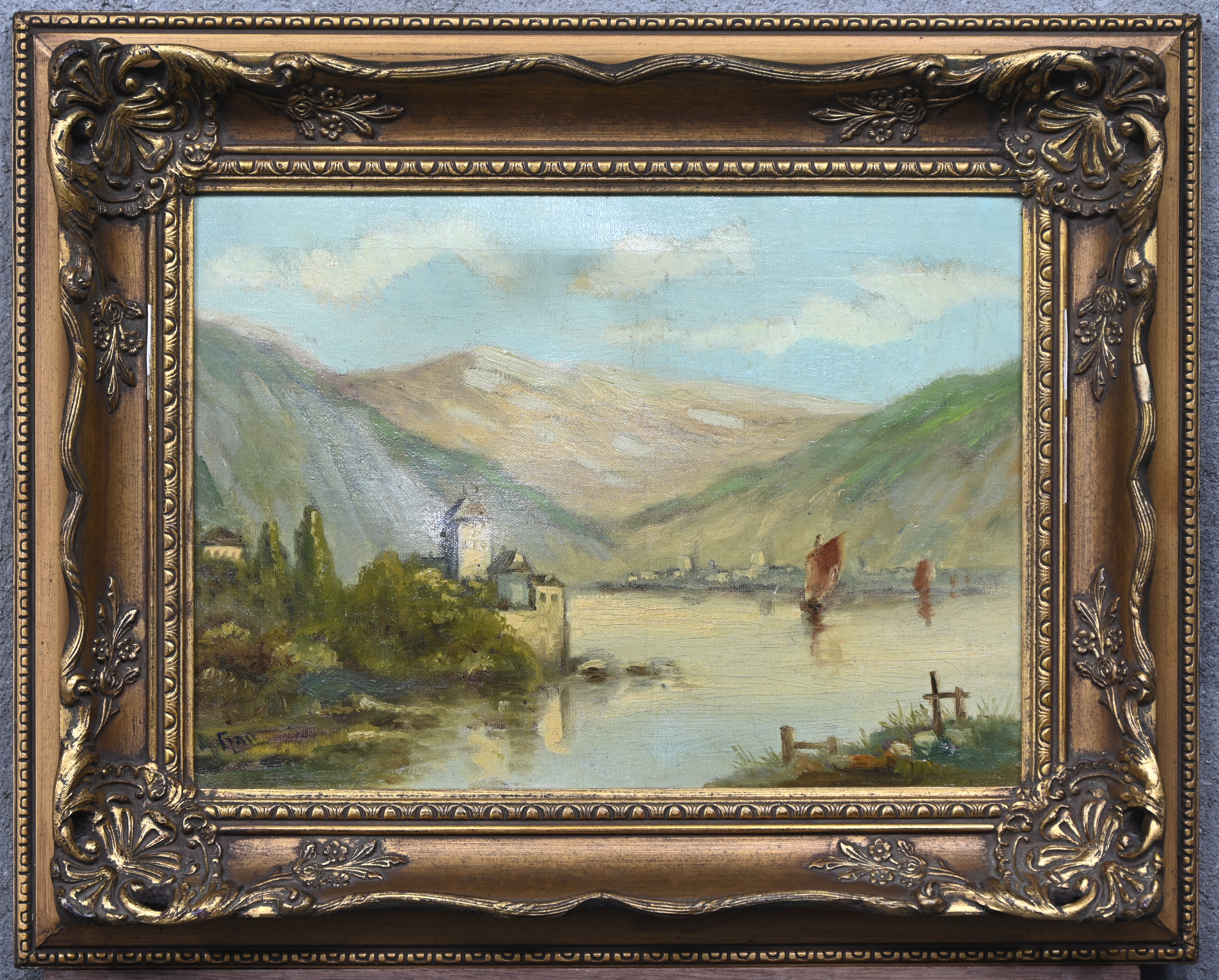 "Windmill by the Waterside," a painting, oil on canvas in a gilt frame, signed. -
