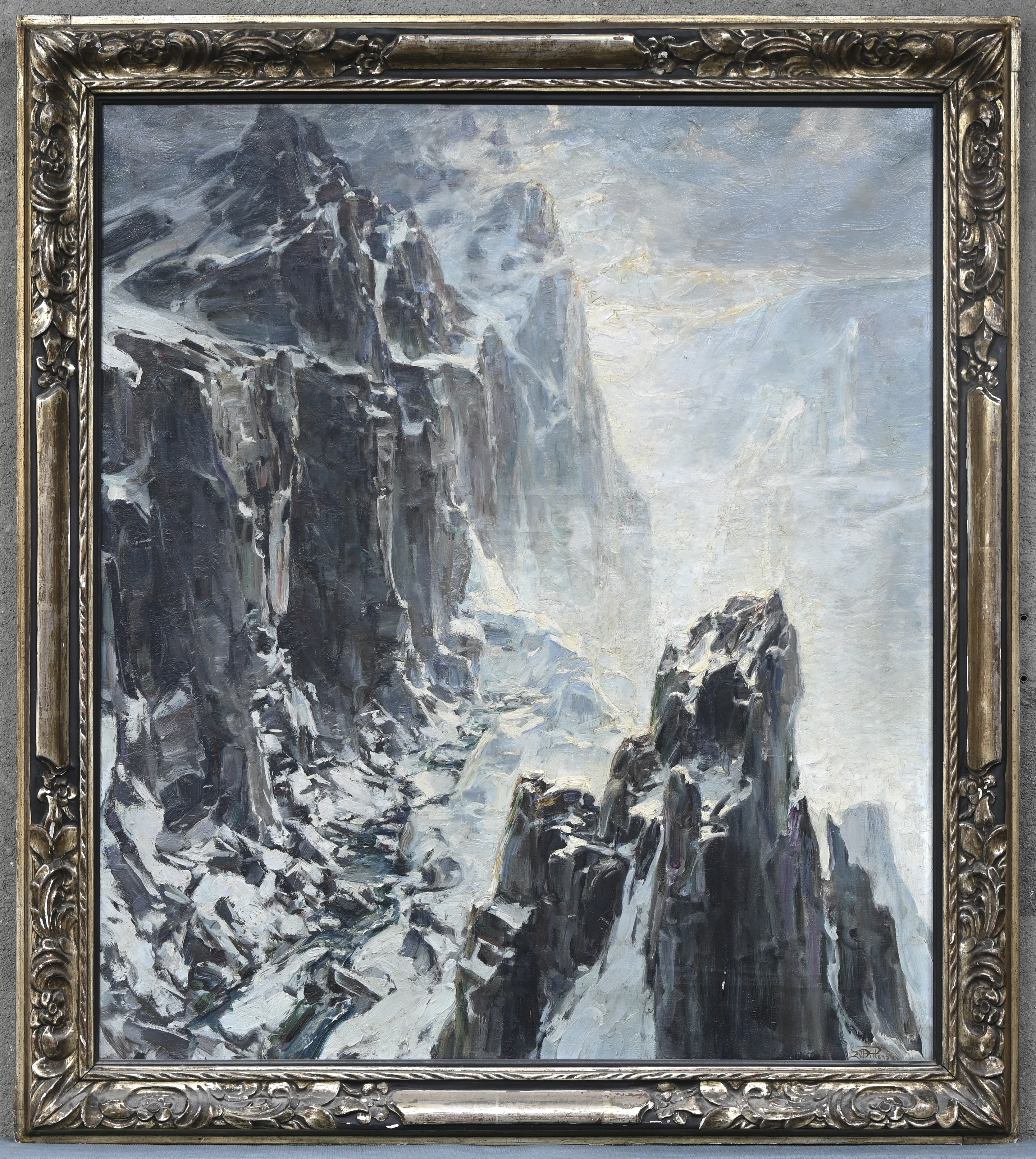 'Snow-covered mountain peaks', oil on canvas. Signed P. Dillens.