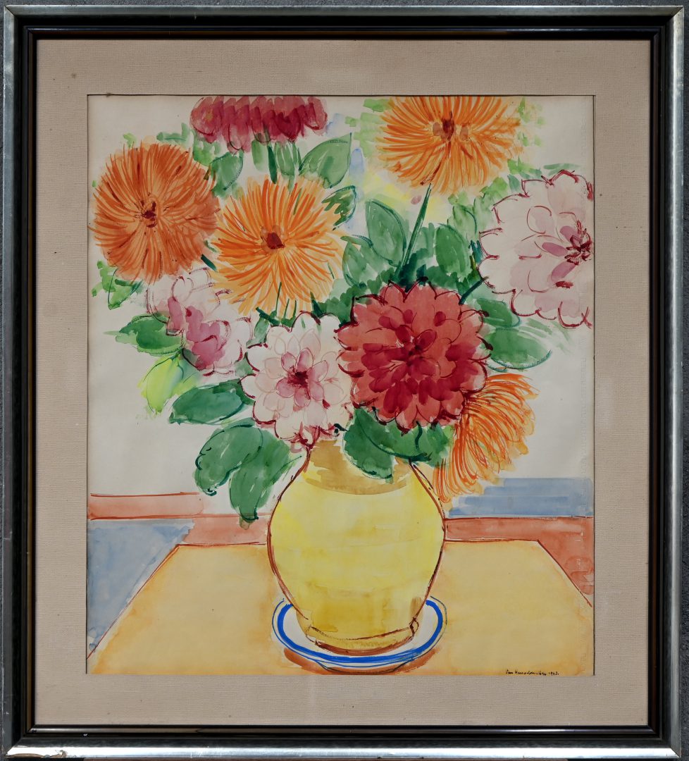 ‘Bloemenvaas’, aquarel op papier. Getekend Van Heesvelde 1943.