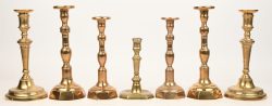 #227Een lot antieke koperen kandelaars bestaande uit 3 sets 18/19e eeuwse en één mogelijk laat 17e eeuws exemplaar.