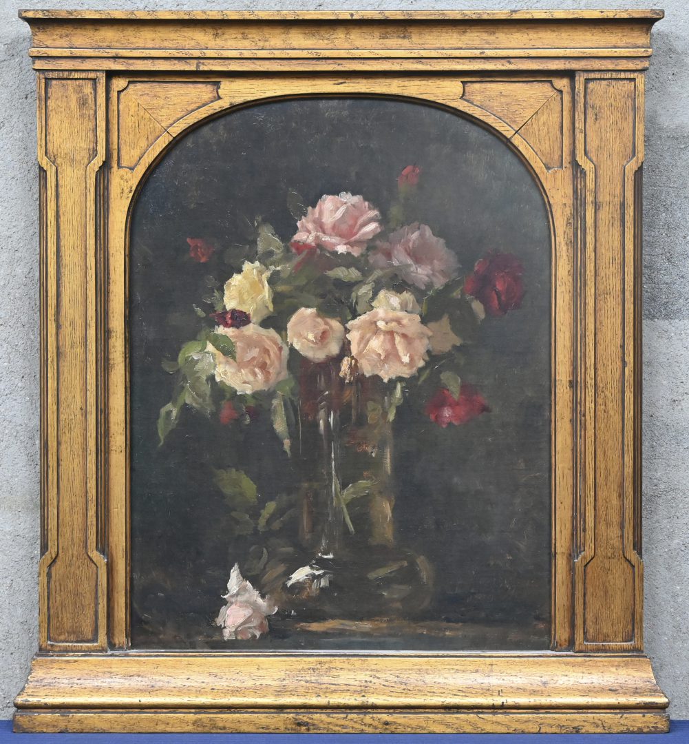 “Bloemstilleven”, een schilderij, olieverf op doek, in vergulde eikenhouten kader. Toegeschreven aan Evert Larock.