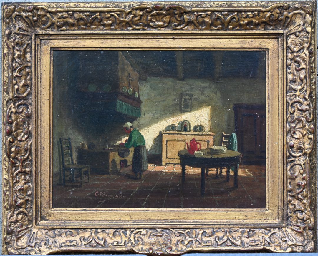 “Boereninterieur met mooie lichtinval”. Olieverf op doek. Gesigneerd